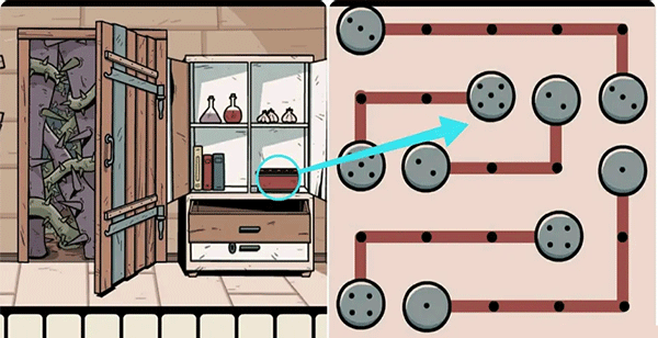 6、输入符号密码打开正大门右边的柜子,再点击右下方的红色盒子完成上面的机关(连连看)即可拿到里面的白色宝石。