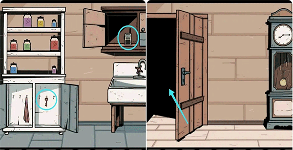 2、打开蓝色的门进入盥洗室,按照片上的提示摆放架子上的罐子,完成后拿走下面的钥匙,接着打开水池上方的柜子拿到对讲机,然后出去用钥匙打架钟表左侧的门。