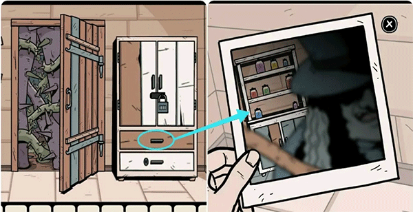 1、先拿走抽屉里的一张照片,在照片里女巫背后的架子上有我们需要的提示。