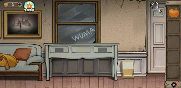 3、然后点击桌面上的食物。在窗户玻璃上看到字母。用字母打开左右边抽屉,左边抽屉用正常的WUMA打开拿到钥匙,右边抽屉用倒着AMUW打开拿到材料。用钥匙打开房门出去。