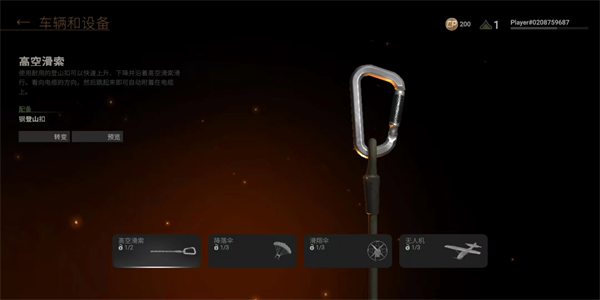 使用耐用的登山扣可以快速上升、下降并沿着高空滑索滑行。看向电缆的方向,然后跳起来即可自动附着在电缆上。