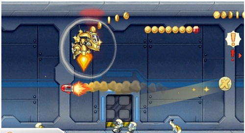 火箭飞人中文版是一款别出心裁的横版飞行射击手机游戏,玩家需要扮演游戏的主人公(Barry)秘密的潜入一座神秘的基地,夺走邪恶的科学家研制的超级火箭飞行器,接着利用这个飞行器进行极限逃生。利用火箭飞行器上的机枪来扫射并通过上下左右飞行移动避开工厂里各式各样的障碍物,有固定电闸、可旋转电闸、火箭炮、光束等。当然除了各种的障碍物,游戏中还有金币,其中获得的金币可以用来购买多种道具和解锁特殊装备,使得游戏更加耐玩。同时,随着分数的飙升,玩家们还可以解开各种成就,系统中还有一些小惊喜等待着各位勇敢的冒险家哦!