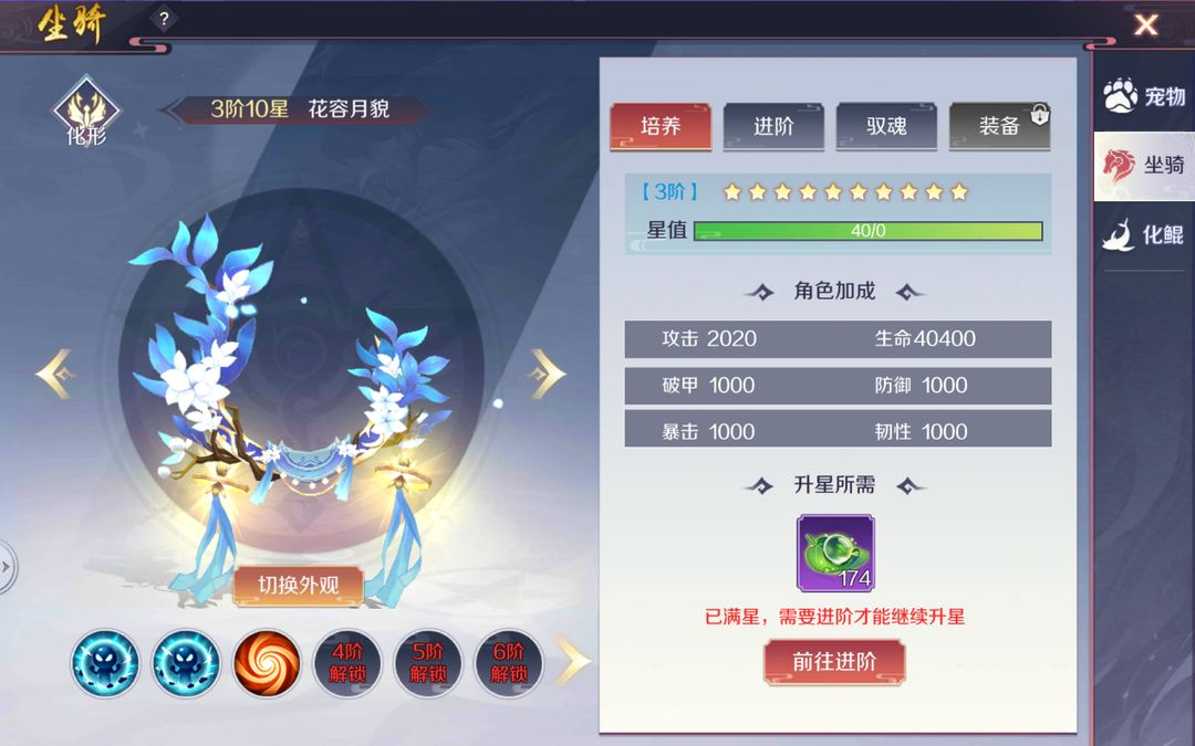 1、坐骑培养可提升角色基础属性,满星后可通过进阶来解锁新的培养上限。
