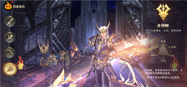 圣导师所使用的武器是权杖,擅长伤害爆发、生存,拥有各种增益。圣导师是比较综合性的职业,防御属性非常出众,在组队刷BOSS的时候完全可以在前排吃伤害充当肉盾。虽然没有大爆发伤害,但技能多以群伤和控制减速为主,配合队友能打出非常理想的效果。