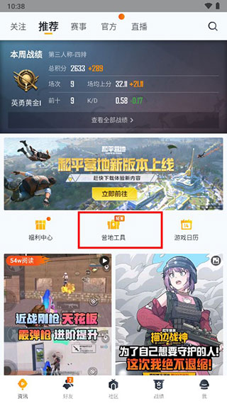 4、打开营地工具页面,即可找到游戏工具(即:对局工具,注意该工具需要当天登录营地,才能激活游戏内的工具功能)
