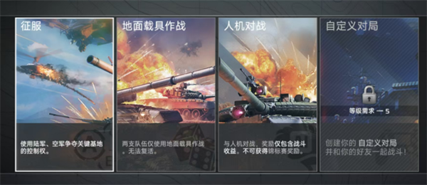 地面载具作战:5v5对局,双方玩家需在地图中驾驶己方坦克摧毁敌方坦克,最先全歼敌方的视为获胜。该模式下每个玩家仅可转载1驾坦克。