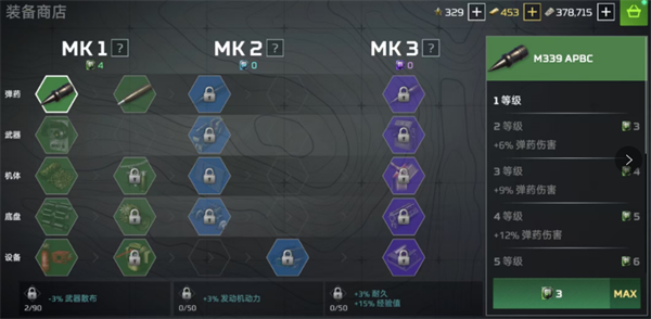 2、装备升级:每辆坦克都有独特的装备升级系统,可升级的装备包括弹药、武器、机体、底盘和设备。不论是MK1、MK2还是MK3都建议优先升级弹药、武器和机体。