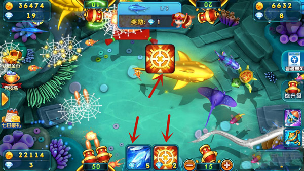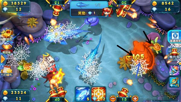 在捕鱼过程中,应紧紧抓住炮台附近游过来的慢鱼,比如食人鱼、魔鬼鱼、乌龟……这些只要是慢慢悠悠地游过炮台附近的鱼基本都是送分的,只需要把炮口方向调到40度左右并选择好炮台,基本发射一两发子弹就能全部收入囊中了。不过若是长时间得分,大家就要谨慎了,因为这说明游戏正处于一个放分周期,但这周期随时可能会发生变化,若是玩的起兴而不注意,就很有可能将之前赢得的金币全都花光。