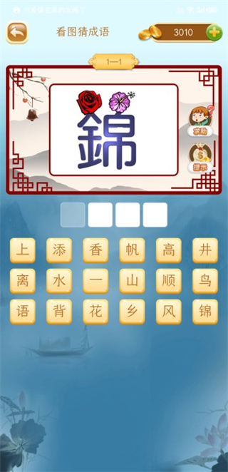 玩家可以根据给出的部分成语和提示填写完整的成语,或者根据上一个成语的最后一个字接下一个成语的第一个字。
