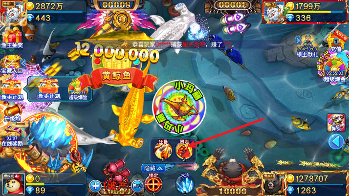 如狂暴道具能提升炮台威力,炸弹道具可瞬间消灭屏幕上的部分鱼等,根据游戏局势灵活运用。