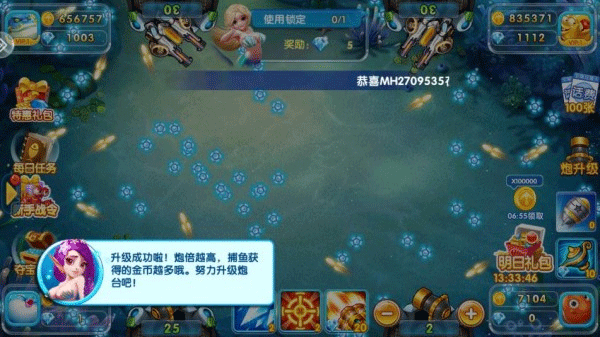 3、升级成功,炮倍越高,捕鱼获得的金币越多,努力升级炮台吧;