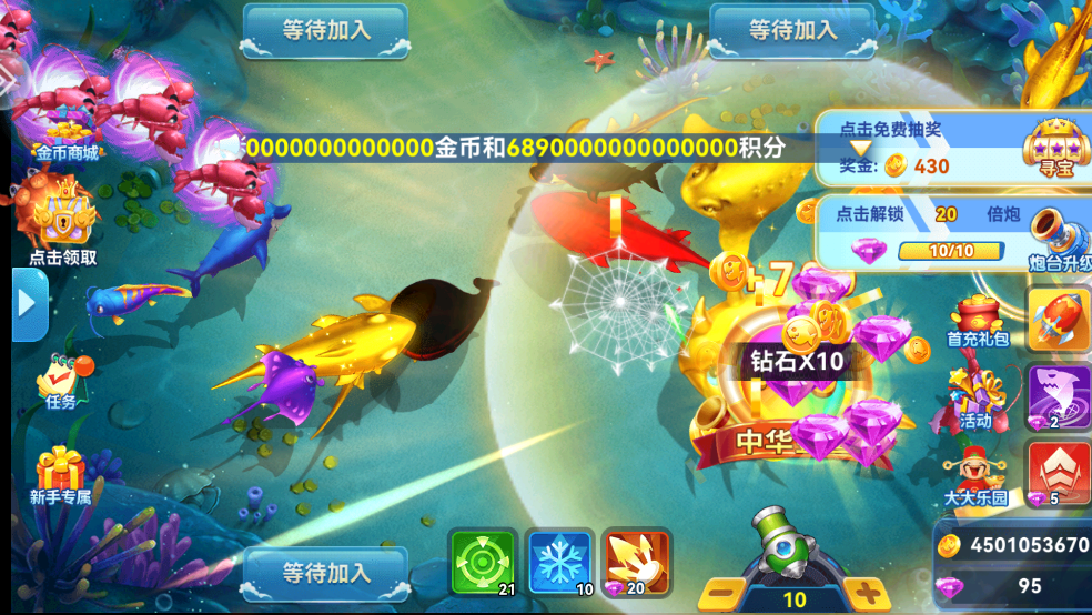 2、开炮会消耗金币,成功捕获鱼群后可获得对应数量的金币奖励。