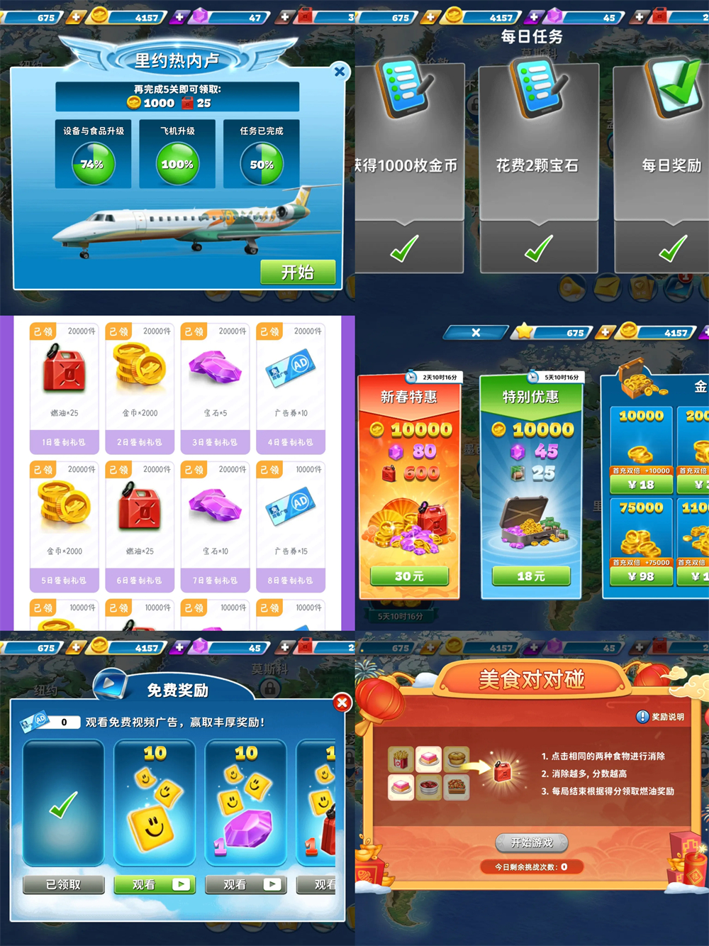 飞机大厨有一个最大的苦恼就是油不够,可以通过活动,签到,任务,看广告以及买礼包的方式获得燃油,同时每完成五个关卡,也会有相应的金币,燃油,钻石奖励。