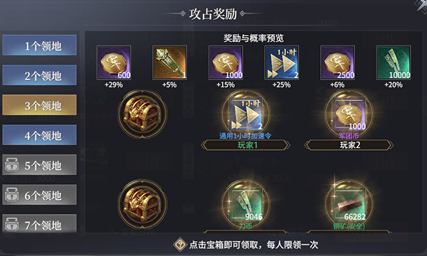 攻占达到一定数量后,军团内的所有成员还可以领取一次宝箱奖励
