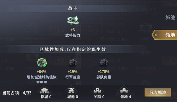 区域性加成,此种类型的军团城池在对应的郡内,玩家城池或行军部队可以获得属性效果