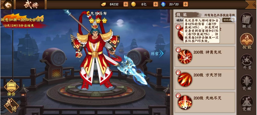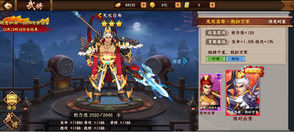 目前无双吕布的战意正处于第二阶段“战意如潮”,拥有20%攻击伤害加成。可能有人会讲,无双吕布的战意已经削弱,伤害已经不行了。事实也的确如此!但笔者认为,“削弱”只是相对于巅峰期的无双吕布而言。对比其他PVE武将,即便是20%伤害加成依然有明显优势。这里的攻击伤害包含武将技能伤害,天书伤害,道具伤害,普攻伤害等等。而不是像无双诸葛亮一样,仅限于技能伤害。
