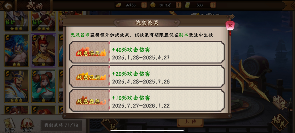 无双吕布是唯二拥有副本战意BUFF的武将。并且相较于无双诸葛亮的战意效果,无双吕布的战意效果适用性更加广泛,并没有诸多限制条件,是当之无愧的最强战意。无双吕布的战意分为三个阶段,分别是: