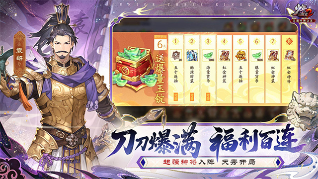 王者归来,霸业在握。616少年节万元重磅福利狂欢开启,紫金品质神秘宝箱盛典期间惊喜放送!百元资源好礼每天上线每天领,还有超万元大礼包直送,含双份10888元宝、紫金锦囊、紫金装备、金将令等总价值数万元的道具奖励!参与“少年巡礼”活动,完成任务攒积分,更可解锁紫金武将两名、紫金神兽、紫金神兵、紫金兵符等重磅豪礼!616当天登录游戏还能直领紫金武将一名!资源丰厚,助少年成就大业!