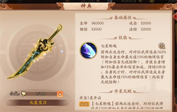 最后就是七星宝刀了,七星宝刀对于平常玩家来说,不易获得,但他是神兵中品级最高的神兵,可以选择尽量升星、升级,属性上也比一般金神兵要高出许多,7星后的技能也很强劲,前两次攻击附加有20%自身生命值的高额伤害,死亡后还有高达40%自身生命值的伤害,触发后还有着35%的暴击率和伤害加成,大幅度提升了自身伤害,一次性打出高额的输出,即使死亡也会多出一些输出,每升星一级,都有技能上的增强,可以优先升星。