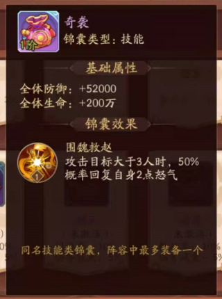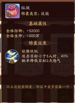 四个紫金品质的锦囊,剩下的两个锦囊——奇袭与纵敌,其实根据锦囊技能很好理解,奇袭更适合攻击目标比较多的,大于三个攻击目标的武将,比如小金刚、曹节、鲁肃等,而纵敌更适合三个目标以下的攻击武将,比如太史慈和姜维。