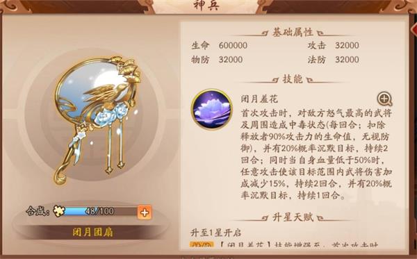 闭月团扇是神兵中唯一一个控制类型的神兵,首次攻击直接使敌方怒气最高以及周围的武将进入中毒状态,有几率沉默两个回合,在自身血量低于50%任意攻击使目标范围内武将伤害加成降低两回合,有几率沉默一回合。