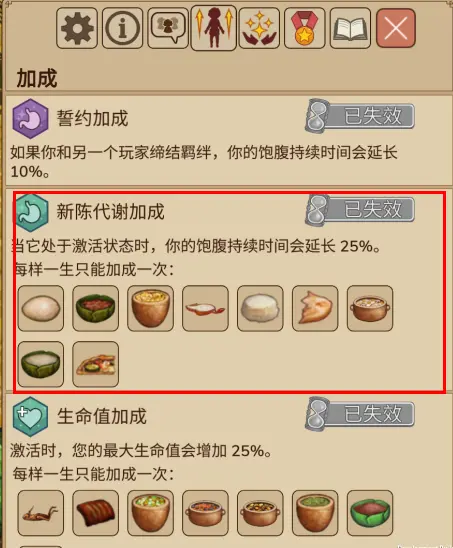 同时,还可以在个人加成中,食用目标食物激活【新陈代谢】BUFF,饱腹持续时间将会延长25%!这对每个初入部落的村民都很重要~