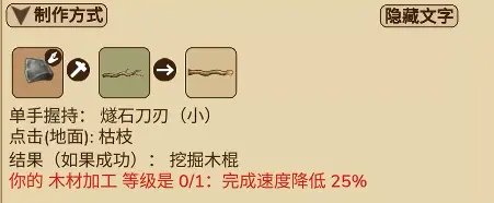 ②将枯枝放在地上后,手上需要拿着燧石刀刃点击地上的枯枝进行交互。即使制作失败也可以继续点击直到制作完成。