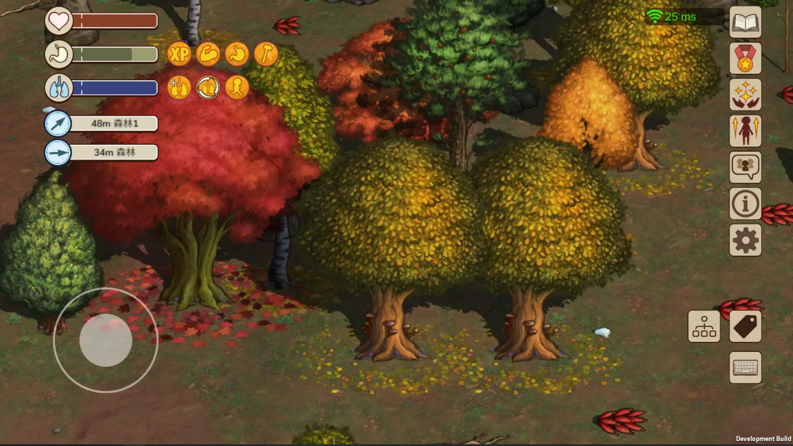 ⑥秋季森林:进入秋季森林的入口是有三个独立的小矿区,可涉水抵达。这里是众多村民们建家的第二选项,风景优美,内有神秘遗迹。除川鱼、湖鱼以外没有其他生物,相对其他地貌较为安全,但食物来源有限。是获取云梅、平菇、栗子蘑菇、鸡油菌、牛肝菌等蘑菇以及后期采矿、伐木的主要地貌。