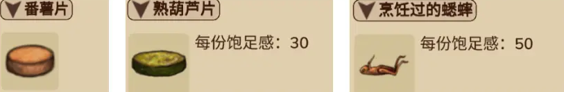 当科技进行到石器时代(一)扁石类别的时候,还可以制作增加更多饱腹感的食物:煮熟的番薯片、煮熟的葫芦片、煮熟的蟋蟀。