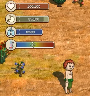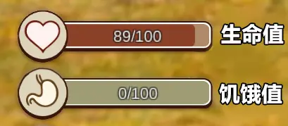 进入部落后,一定要注意角色左上方的饥饿值。因为当饥饿值下降到0时,角色的生命值也会随之下降,生命值归零后,村民就需要重生一世才能再次进入部落。