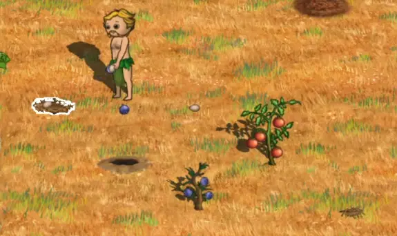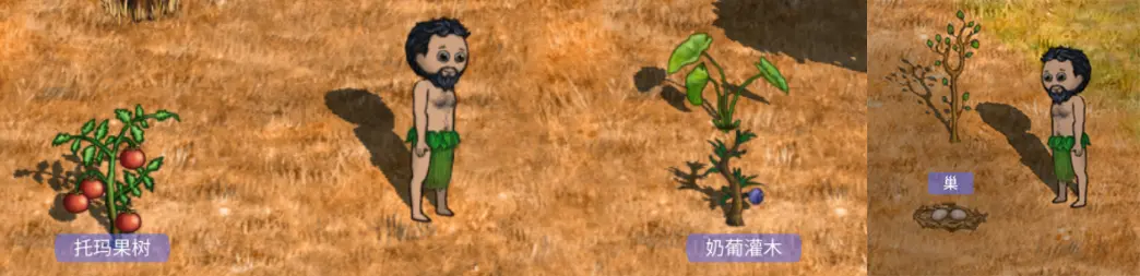 所以对于刚进入部落里的村民,可以随时随地的采集有果实的奶葡灌木和托马果树、鸟巢里的食物,马上食用,应对还未开始建家前的饥饿补充。