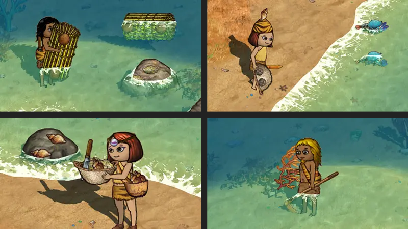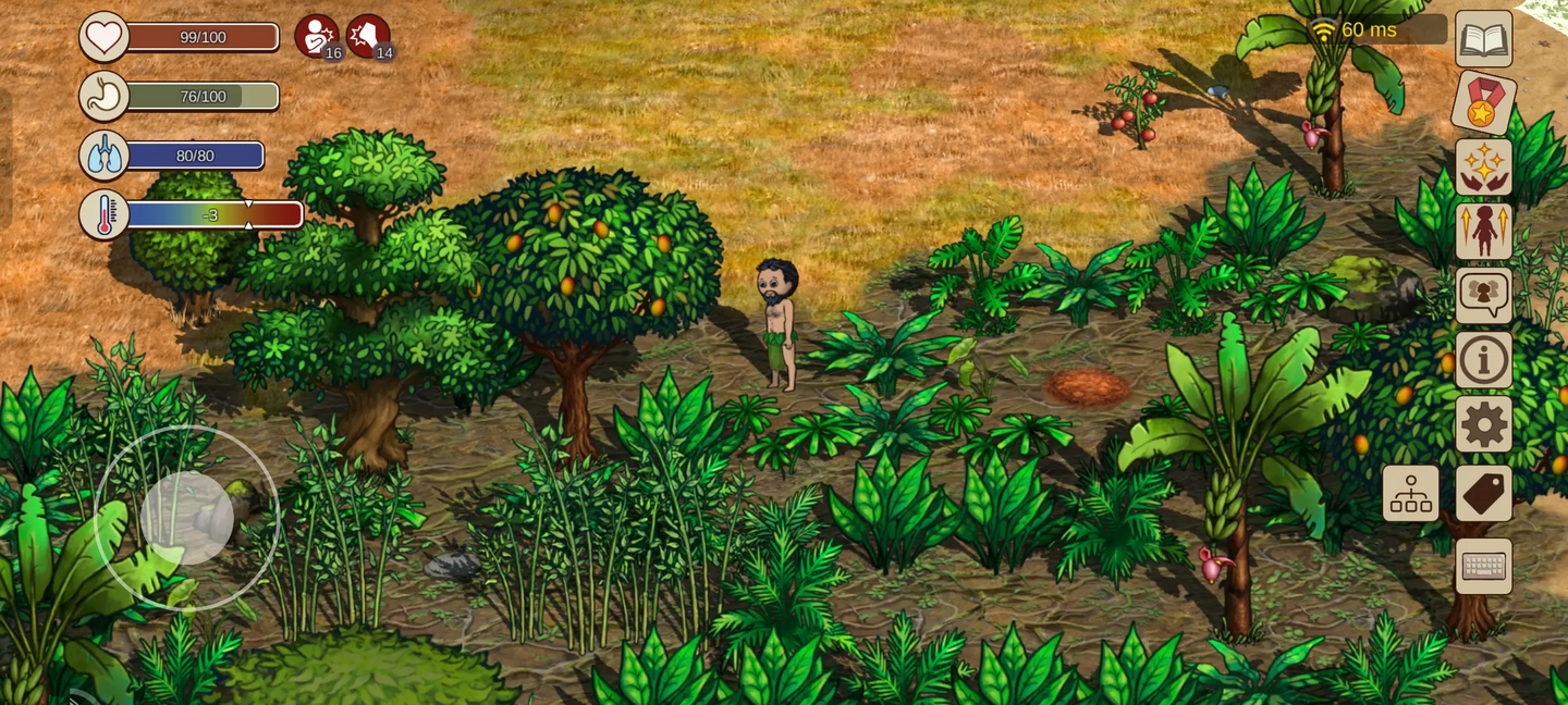 村民进入部落后,双击地图中的任意位置人物就会自动移动前往,或是通过左下方方向盘滑动来操控人物的前后左右移动。村民们可以对物品进行点击交互,人物手上一共可以拿取两个物品,点击地面可以将手中的物品放下,从而进行更多操作。