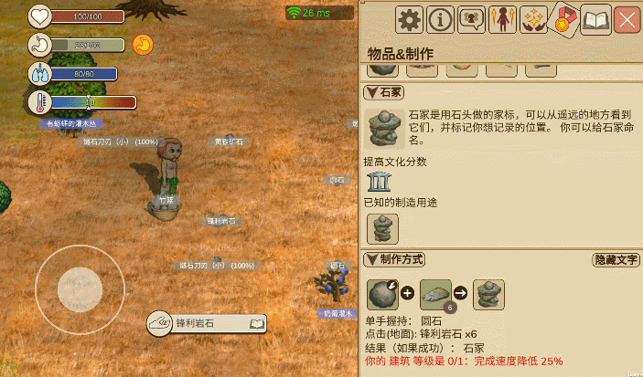 ②收集完毕后,选择你心仪的空地,把篮子里的锋利岩石拿出来堆叠在一起。最后把圆石拿在手里,与地上堆叠的锋利岩石进行交互,建成石冢。