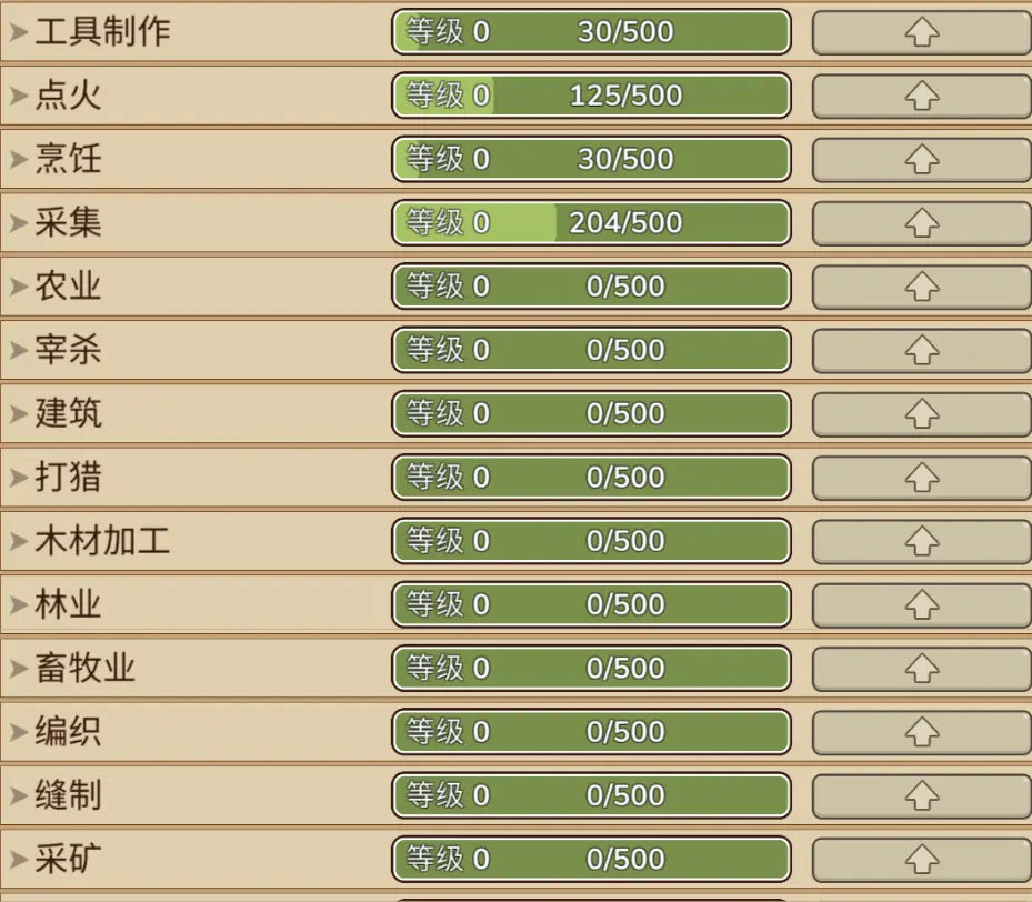 当村民与部落里的物品进行交互(如采集)成功后。能够学习吸取到该项功能的成功经验。当经验值达到上限后就能提升技能水平。
