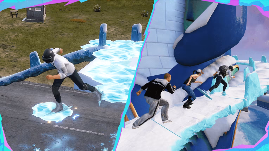 ✧使用后角色跃起,透过摇杆+滑动萤幕控制移动与朝向;移动时沿路径即时产生冰面轨道,其他玩家可站上冰道自由移动。
