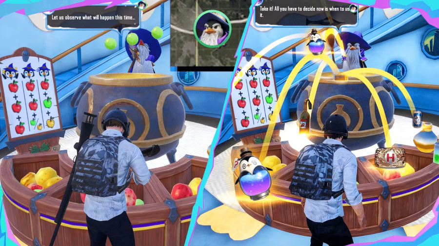 ●炼药师企鹅(普通):与企鹅互动后,它会随机拿出3个苹果药材炼药;同色苹果越多,掉落的物资与变身药水奖励越丰富!小机率触发「炸锅」事件,此时会产出大量企鹅魔药。
