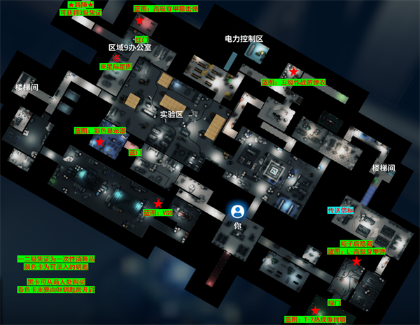 J-Lab实验室可以说是游戏中物资最丰富的地图,经过我测试即使没有实验室颜色卡,每次搜到5、6张显卡也是常有的事,另外实验室还存在一个彩蛋区域,没有准备贸然进入可能会瞬间回到基地。这个地图的小怪基本都是5级、6级的子弹,推进需要小心谨慎,需要注意的是,B2层在没有通电的时候,地图为纯黑且部分电子门是无法使用的。