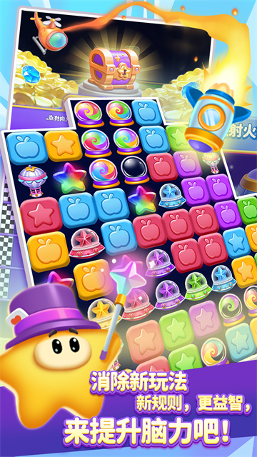 消除多个星星果冻,还能变身成美味的软糖和彩虹蛋糕,爆破关卡,更快过关!