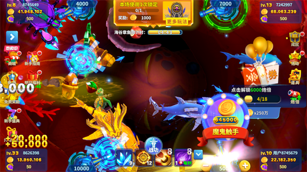 3、当某条大鱼出现,玩家可以使用锁定道具,将大鱼设为目标之后,再加上极速,这样炮弹的发射速度变得更快,抓到大鱼的几率越大。