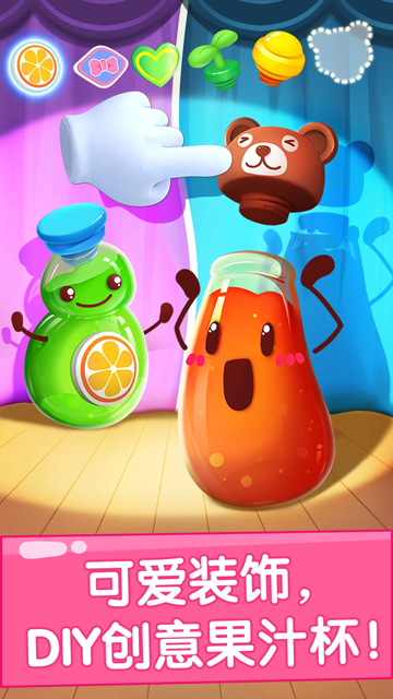 为客人准备一份惊喜吧。使用好看的瓶塞、贴纸来装饰果汁,再放入冰块,冰镇的果汁就做好啦。卖给客人,赚来的金币还能解锁更多的道具哦。