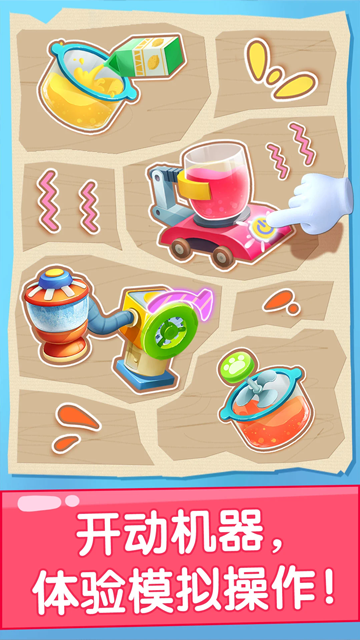 在加热容器里融化糖块,用混合器将果汁汽水融合、在灌装机上将果汁装好……神奇的机器世界,等宝宝大显身手;