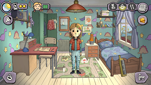6、界面右上角显示着孩子的三项状态:娱乐、清洁和饥饿。你需要合理安排活动,确保它们保持在正常范围,避免出现红色警示。