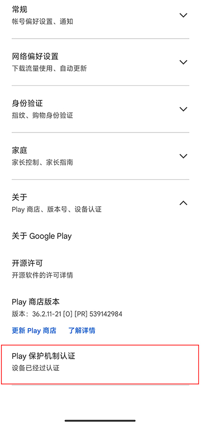 4、如果都显示通过,那么我们关闭PLay应用商店,然后清除应用商店的全部数据,再打开应用商店依次点击头像-设置-关于,此时PLay保护机制认证如果为通过,表示我们成功了。此时我们打开Monster Hunter Now就能直接登录游玩了。