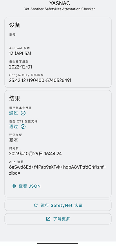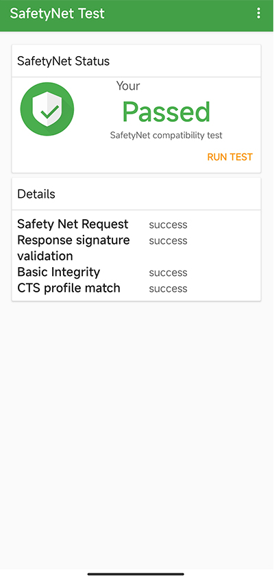 3、刷入完成后重启手机,并下载SatetyNet Test或者YASNAC应用来测试是否通过SatetyNet,通过时如下图,未通过会显示fail