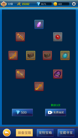 当推图卡住的时候,可以进行寻宝,最多20次十连抽,可以获得大量装备道具,提升战力。
