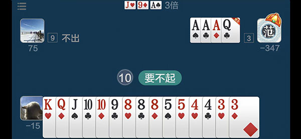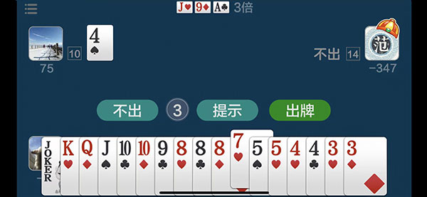 三张底牌将属于地主,收牌前需要亮出底牌让所有人都能看到。地主首先出牌,然后其他选手按逆时针顺序依次出牌,需要跟牌时,可以选择“不出”或出一副比上一个玩家大的牌。当有选手出完牌时则结束本局比赛。