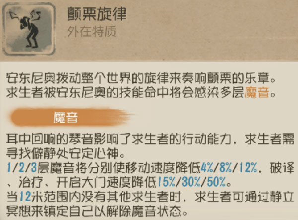 【魔音】可以降低求生者移动、破译、治疗和开启大门的速度;