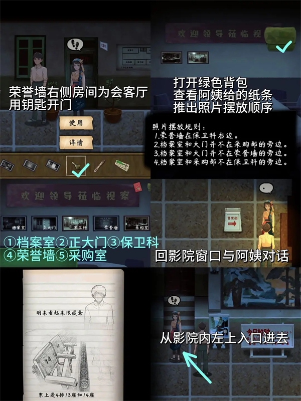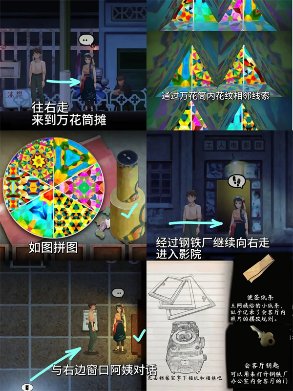 3、涉及万花筒拼图、与阿姨对话,经钢铁厂进入影院,获取纸条和钥匙