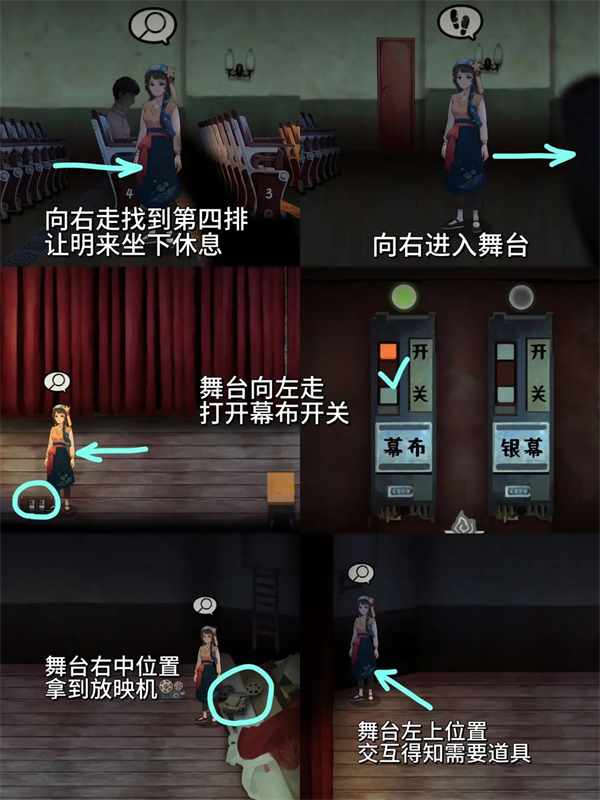 9、在影院内安排明来休息,进入舞台操作幕布、获取放映机,发现道具需求