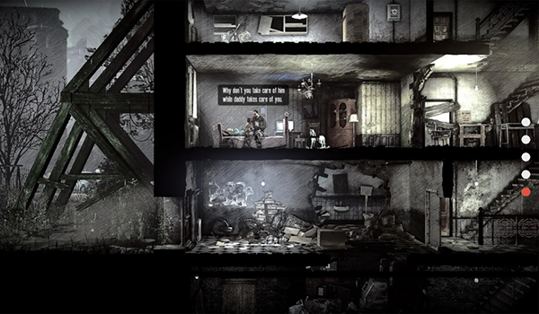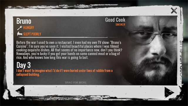 v1.6.9这是我的战争官方正版是一款著名的战争动作冒险手机游戏,游戏中玩家所扮演的并不是士兵,而是普通的平民,在充满战火与硝烟的城市中想要生存下去就得四处寻找食物、武器等能够让自己活下去的东西,在这座城市中同样存在着许多邪恶的或者是友善的幸存者,玩家可以选择帮助或掠夺他们,也可以同他们做交易,玩家需要管理游戏角色的口粮、医药、防御以及情绪等要素来维持生存。这是我的战争手游极具代入感和情感共鸣,游玩中让人深深体会到战争带来的惨剧,是一款非常具备沉淀感和气氛感的游戏。